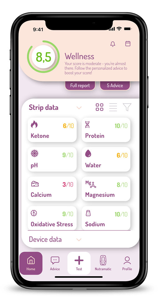 an at-home urinalysis test that provides deep, real-time nutritional analysis, returning insightful results for key physiological biomarkers.