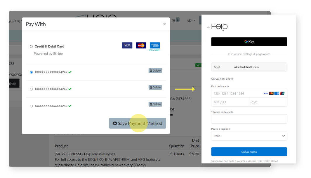 If you have enabled the AutoRenew function on your Wellness+, the system automatically proceeds to the payment of the necessary amount by following the list of payment methods you previously set in your account on the shop.helohealth.com.