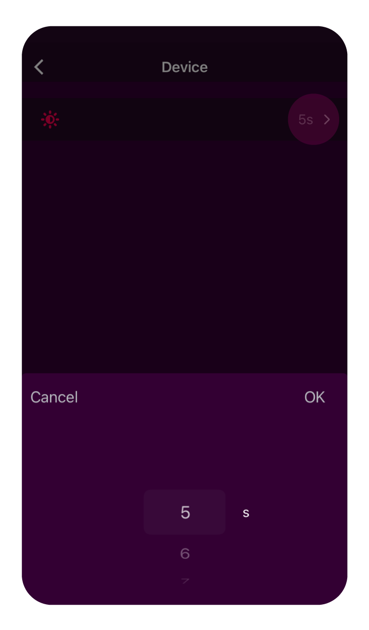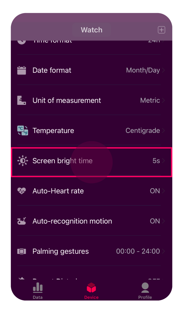 1. Log into the App and go to the Device page. Scroll down until you reach “Screen bright time” > Click on it.