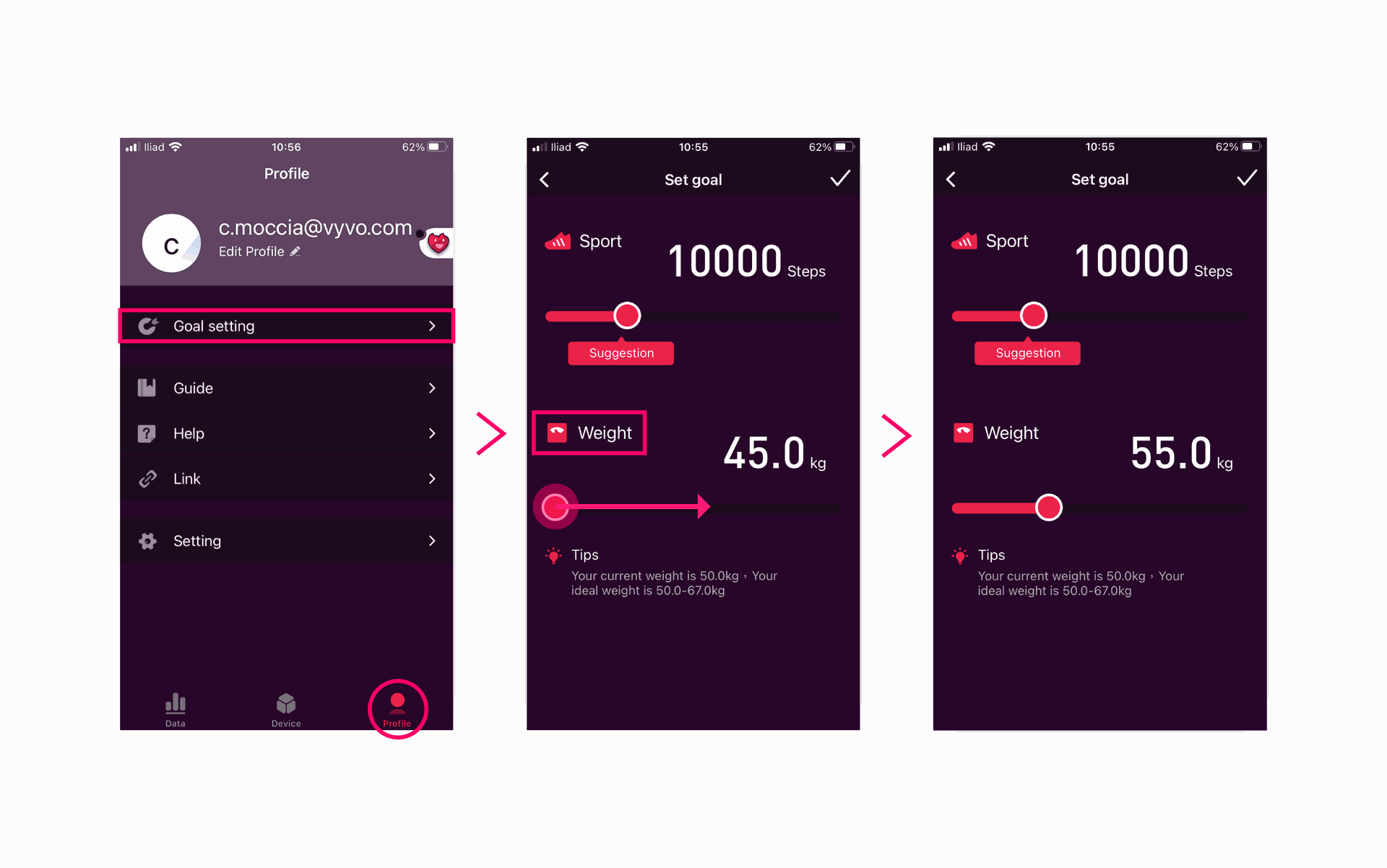 2. Here you can set your goals for daily steps and weight. Slide your finger on the screen to move the red circle on the horizontal bar to increase or decrease the number of steps or weight for your goals.