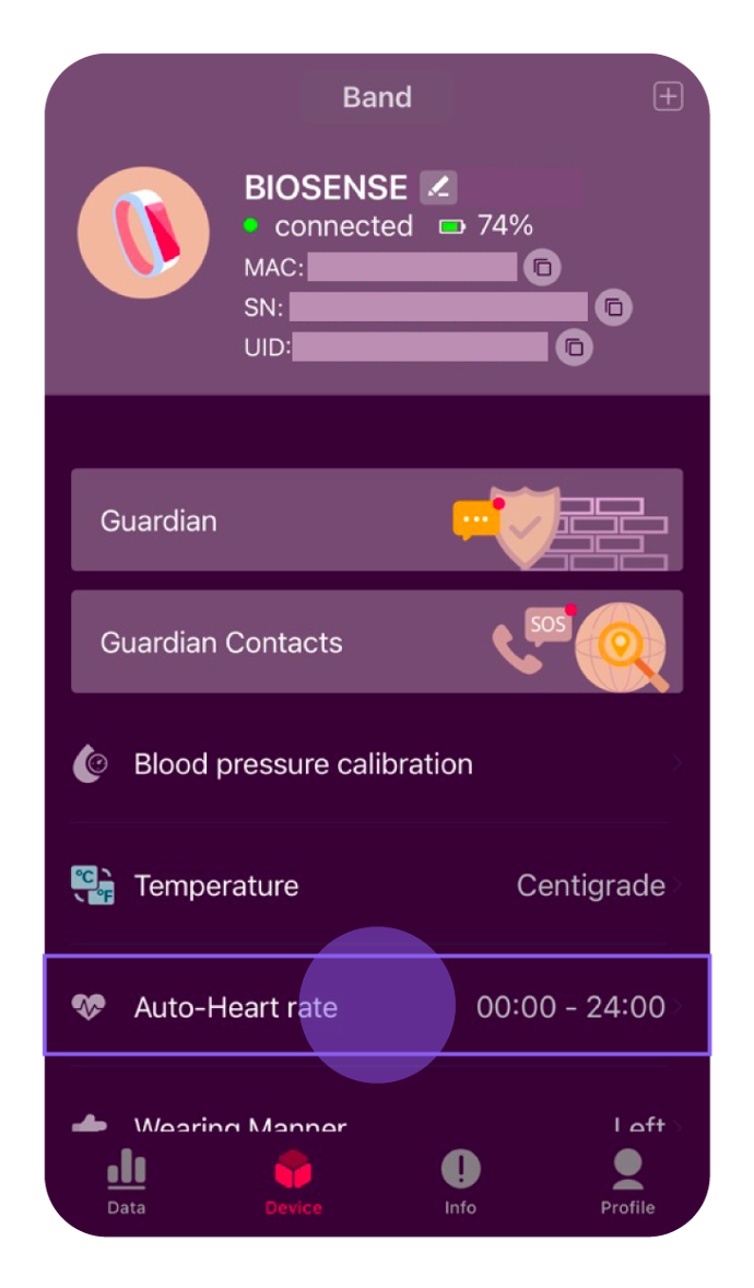 The Auto-Heart rate located on the Device page of the App allows your BioSense to constantly and automatically measure your Heart Rate.