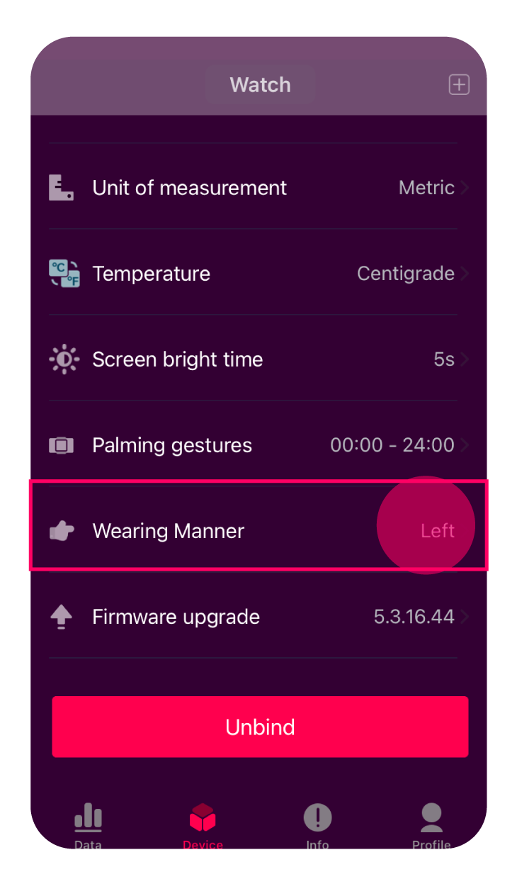The Wearing Manner located in the Device page of the mobile app indicates if you are wearing your LifeWatch on your right arm or left arm. You can update your preferred wearing manner on your App: