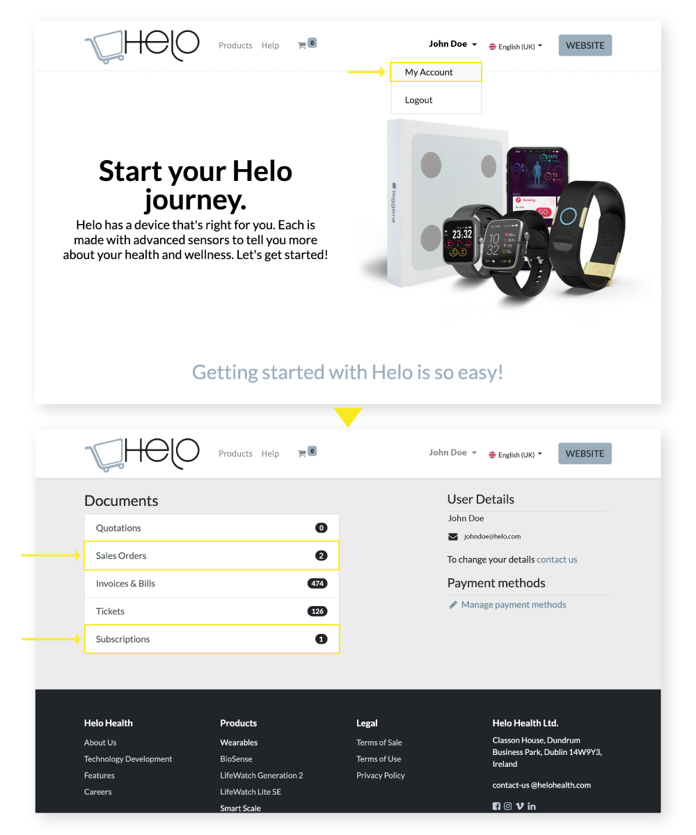 Previous purchases can be viewed on the My account page of Helo Store. All products purchased online are displayed with description, and prices in “Sale Orders” and “Subscriptions”.