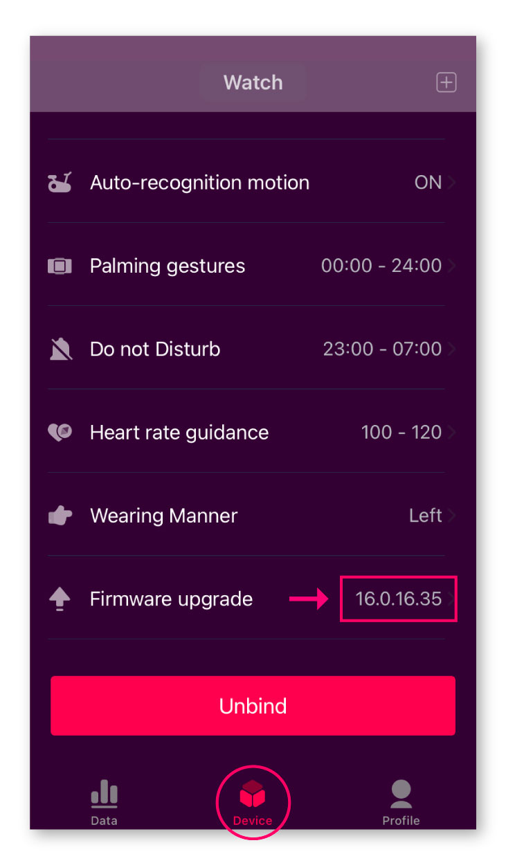 You can find this information by going to the Device page of your App. Scroll the page until you read Firmware upgrade. On the right, you can read the current Firmware version of your device.