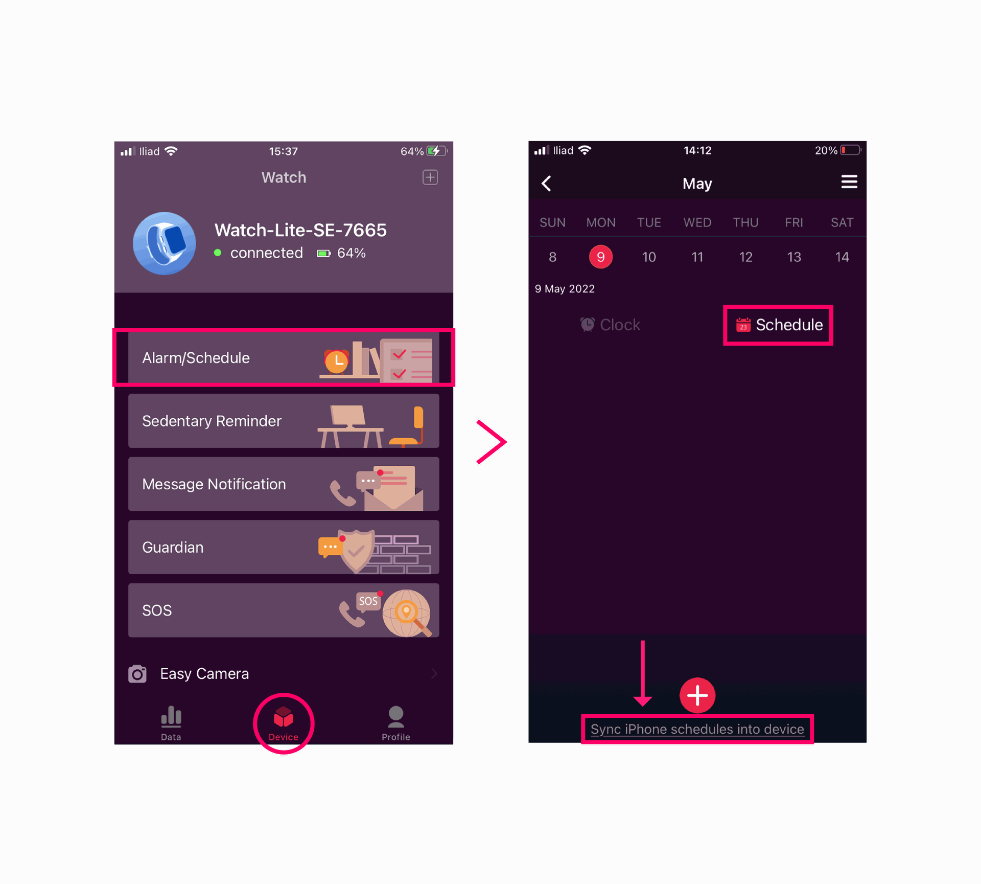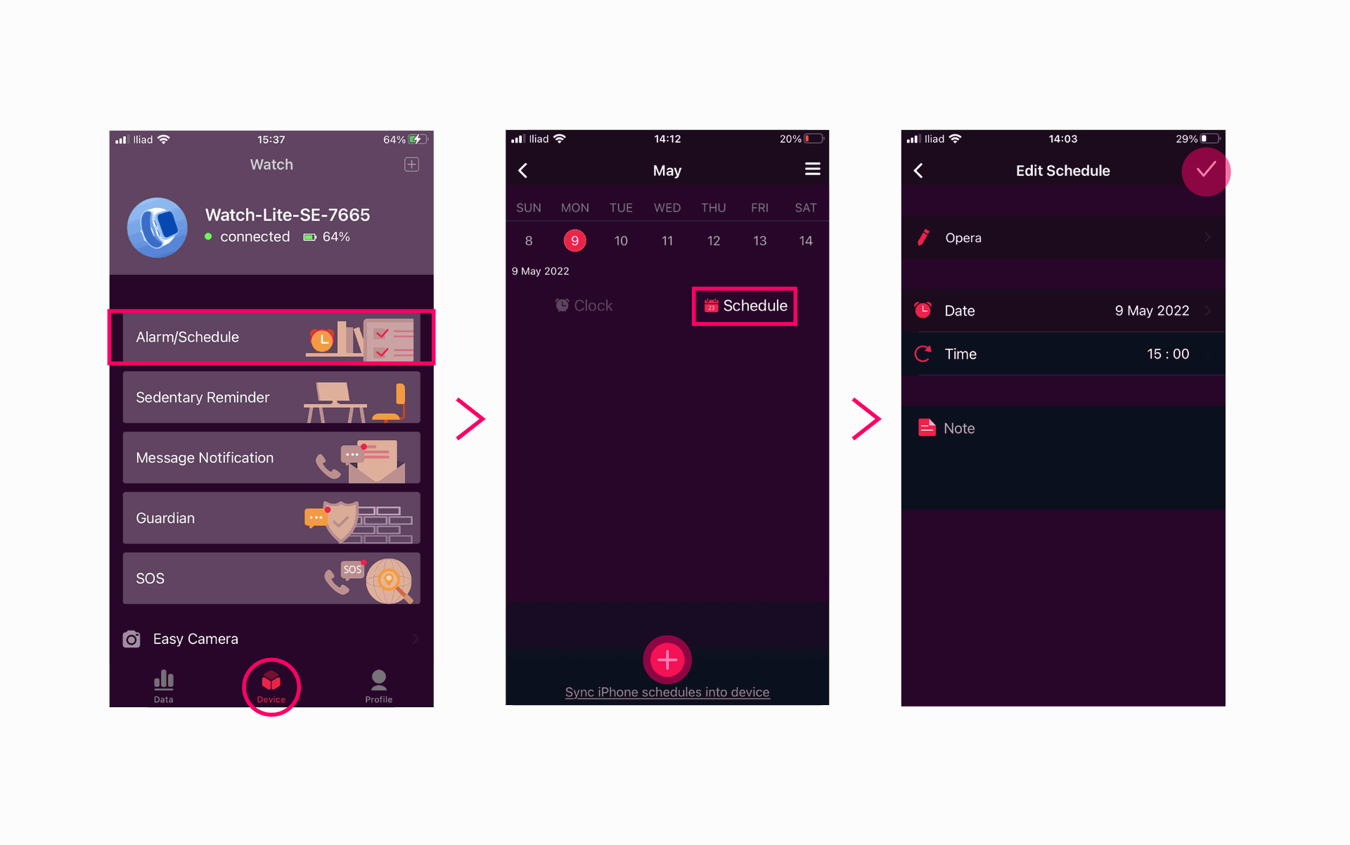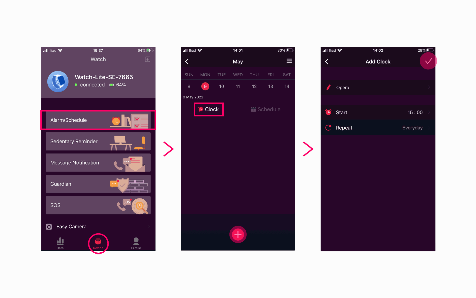 - Log into your App and go to the Device page > Alarm/Schedule.