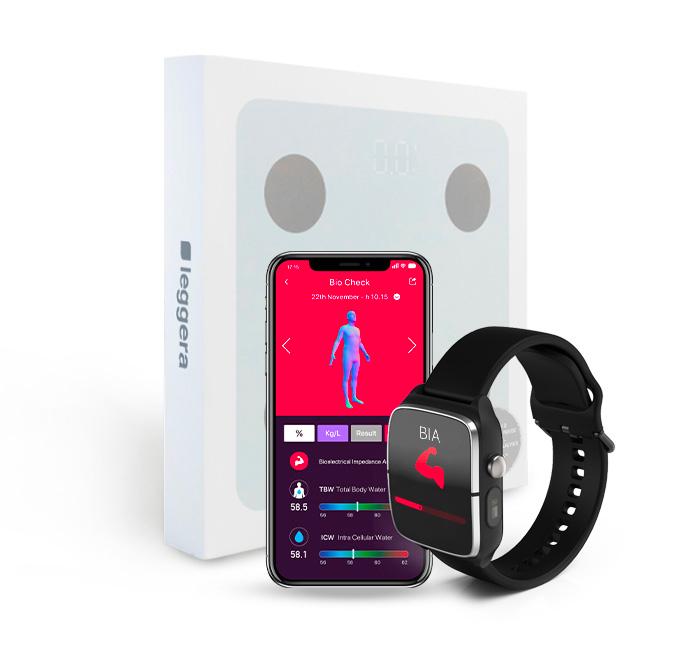By itself, Leggera calculates body composition for the lower torso and legs. The Helo LifeWatch Generation 2 calculates for the upper body and arms. When used together, you can enjoy a complete and highly accurate body composition measurement.